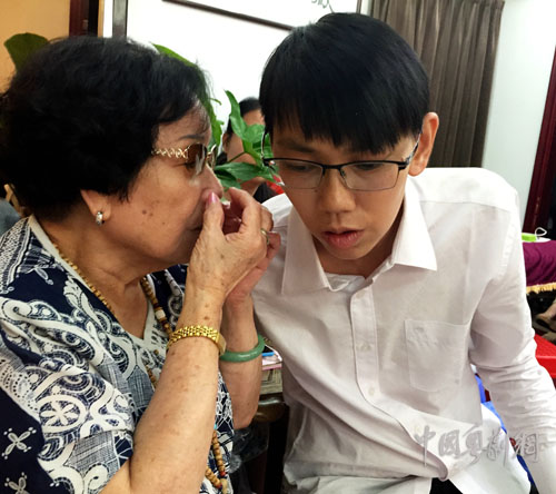 采访结束之后,徒孙们抓紧难得共聚一堂的机会向师公请益,师公也很乐意教导这些热爱粤曲的年轻人。马桂生同学有幸得到师公面对面指导他如何打开鼻腔共鸣,将高音区升上前脑共鸣腔。陈文华同学拿了登载有采访师公文章的《南国红豆》杂志,请师公签名留念。