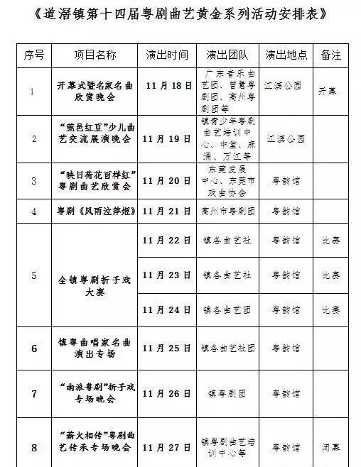2016年道滘镇第14届粤剧曲艺黄金周的内容丰富多彩,包括有折子戏大赛、“映日荷花百样红”粤剧曲艺欣赏会、“莞邑红豆”少儿粤剧曲艺交流展演“等8个系列共10场演出活动。