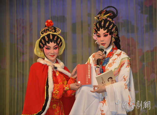 琼霞所收爱徒吴东梦毕业于广东粤剧学校,曾于2012年获得广东省首届青少年粤剧粤曲大汇演金奖第一名,2015年又夺得广东省第八届戏剧演艺大赛金奖,从她在晚会上演出的折子戏《红线盗盒》中,大家可看到她功底扎实,富有朝气和活力,在唱与做方面均很有潜力,确在不断成长。令观众们特别瞩目的是,红线女之子马鼎盛也专程来到了现场,与观众一起见证了这段师徒缘,并大力鼓励东梦“勤奋学艺”。只见东梦这位90后的优秀青年演员俯首低头,恭恭敬敬地将斟上的香茶举过头顶递向师傅,琼霞开心接过,含笑点头,然后又回赠了两本书——《红线女唱腔曲谱选》和《永远的红线女》,她说到,1999年1月,自己就是以同样的斟茶拜师仪式,正式成为红线女的入室弟子,她希望爱徒“与自己一样孜孜不倦地认真学习女姐的可贵精神,肩起弘扬红派艺术的责任,让红派艺术绽放光彩!”