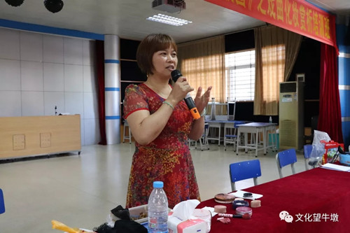 培训中,授课老师分别从认识皮肤、化妆品、化妆工具等基础知识入手,讲解了粤剧表演妆粉底的打法、眉毛的画法等,让学生们对粤剧表演化妆有了一定的认识。