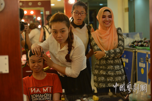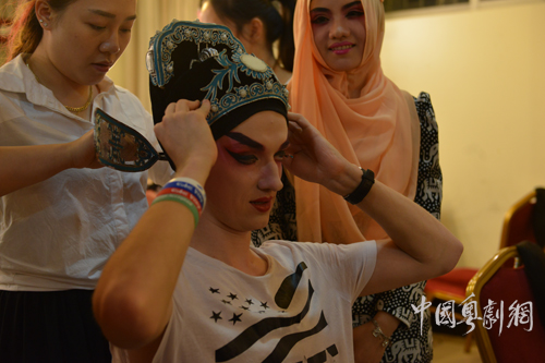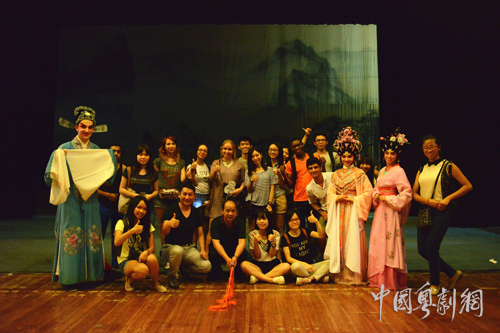 演出前,志愿者参观了后台,观看了演员们化妆、扮相。琳琅满目的戏服和舞台道具吸引志愿者眼球,他们纷纷拿起手机、相机留下影像。