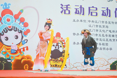 “启明小学的同学仔,你们有没有见到我的大师兄孙悟空?”“见到了!”粤剧享有“南国红豆”之美誉,为贯彻江门市文化惠民理念,推进传统文化进校园工作,5月24日上午,2016年江门市“红豆飘香进校园”活动启动仪式在启明小学校园内举行。江门市委宣传部、江门市文广新局、江门市教育局相关负责人以及学校、家长代表和近2000名师生参与了启动仪式,欣赏了市粤剧团表演的精彩粤剧折子戏。