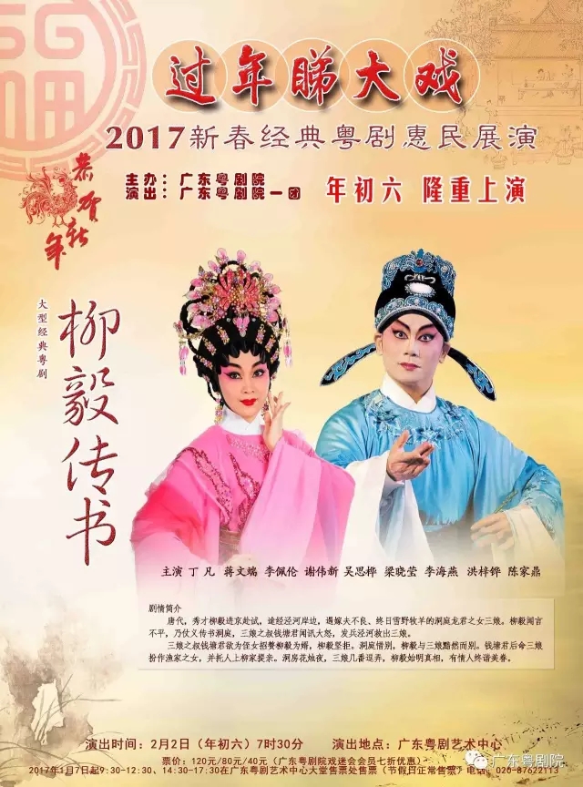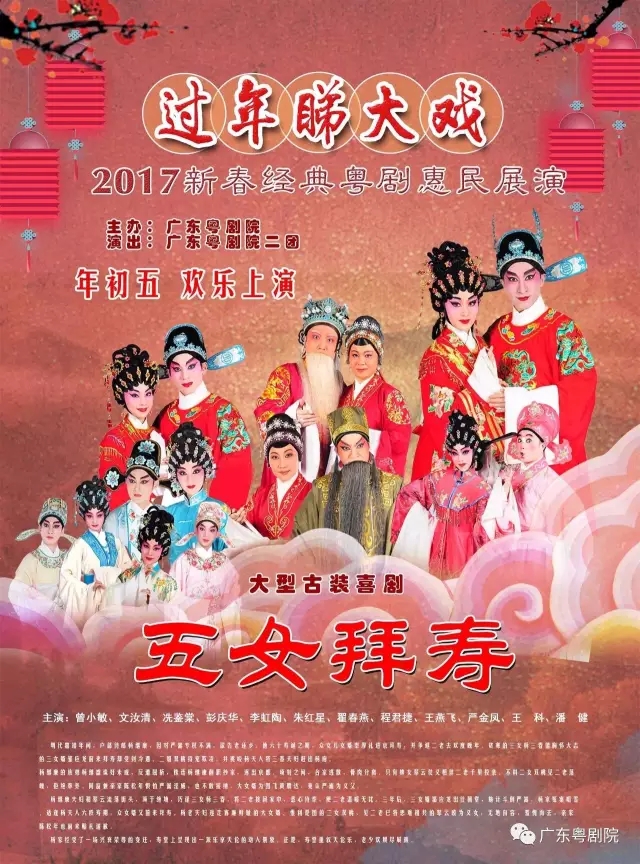广东粤剧院邀您“过年睇大戏”,广东粤剧院将于2017年2月1、2日(年初五、六)晚,在广东粤剧艺术中心上演由曾小敏、彭庆华、文汝清、李虹陶、朱红星等主演的大型古装喜剧《五女拜寿》,由丁凡、蒋文端主演的大型经典粤剧《柳毅传书》,敬请期待! 【演出海报】 《五女拜寿》演出海报 《五女拜寿》剧照 《柳毅传书》演出海报 《柳毅传书》剧照 票务信息 票价:120/80/40元(会员凭卡七折),1.2米以下小朋友谢绝进场。 票务电话:87622113 1月7日起9:30-12:30、14:30-17:30可在剧场一楼购票(年三十至年初四在传达室售票)。 本稿件转载自广东粤剧院公众号,仅作传递资讯之用,本网站不对其稿件负任何责任。