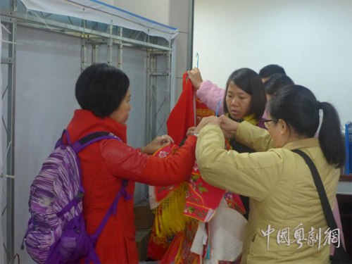 除了学员,还有这样一群靓丽的身影。他们一开始只是帮忙搬搬道具,到了后来,从出发时的维持秩序,准备时的化妆、穿戏服,到演出前的后台维持,演出后的道具装运等等工作,都不辞辛劳,一力承担——他们就是由学员家长自发组成的志愿小组。每次演出,家长们就在微信群里接龙报名,争当志愿者。有一次演出《飞兵奇袭沙家浜》,距离开演不到2小时,带队老师发现道具箱里不见“新四军”的袖章。一位志愿者妈妈当机立断,跑到剧场附近买了十二条红领巾,用针线缝成了袖章,赶在演出之前制作穿戴完毕,顺利而成功地完成了演出。