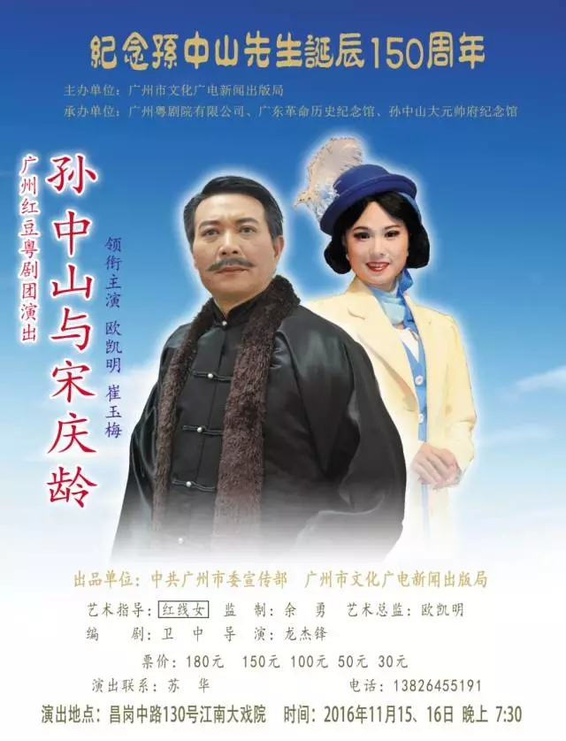 2016年11月12日是伟大的民族英雄、中国民主革命的伟大先驱孙中山先生诞辰150周年纪念日。为缅怀孙中山先生为民族独立、社会进步、人民幸福所建立的历史功勋,学习、继承和发扬孙中山先生的爱国思想、革命意志和进取精神,巩固和发展海内外中华儿女的大团结,巩固和发展最广泛的爱国统一战线,维护两岸关系和平发展,共同推进祖国和平统一大业,最大限度地把全民族的力量凝聚起来,致力于实现“两个一百年”奋斗目标和中华民族伟大复兴的中国梦。广州与澳门两地多单位共同举办纪念孙中山先生诞辰150周年系列活动。 其中,由澳门佛山禅城联谊总会主办,澳门佛山联谊会、澳门石湾同乡联谊会、广东省革命历史纪念馆、孙中山大元帅府纪念馆联合协办,广州粤剧院承办的《纪念一代艺术宗师罗家宝、陈小汉经典戏曲鉴赏晚会》和大型新编粤剧《孙中山与宋庆龄》,将于11月10日在澳门文化中心综合剧院上演。该剧由广州红豆粤剧团精彩呈现,梅花奖“二度梅”得主欧凯明和梅花奖得主崔玉梅领衔主演。 为让广州的群众也能参与纪念活动,由广州市文化广电新闻出版局主办,广州粤剧院、广东省革命历史纪念馆、孙中山大元帅府纪念馆共同承办,广州红豆粤剧团将于11月15、16日在江南大戏院上演两场《孙中山与宋庆龄》,敬请关注。 纪念一代艺术宗师罗家宝、陈小汉 经典戏曲鉴赏晚会 演出详情 演出时间:2016年11月9日 晚7:45 演出地点:澳门文化中心综合剧院 票务查询:澳门佛山禅城联谊总会 电 话:2896 5330 大型粤剧《孙中山与宋庆龄》 演出详情 演出时间:2016年11月10日 晚7:45 演出地点:澳门文化中心综合剧院 票务查询:澳门佛山禅城联谊总会 电 话:2896 5330 大型粤剧《孙中山与宋庆龄》 演出详情 演出时间:2016年11月15、16日 晚7:30 演出地点:江南大戏院 演出票价:180元、150元、 100元、50元、30元 票房电话:020-84264893