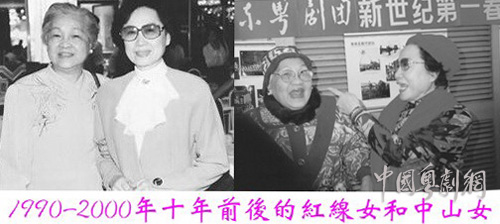五十年代广州有一童谣:“红灯绿灯,红线女嫁马师曾”,可见红线女与马师曾回归前在广州已是妇孺皆知。由于母亲的工作关系,我在童年时看了很多女姐的戏,听的都是“女腔”,在粤剧院考试时,唱一句【长句滚花】也都是按照女姐的唱,当时主考说你唱错了,我说无错,女姐是这样唱的,其实【滚花】男女收腔是不同的,搞到全场大笑。
