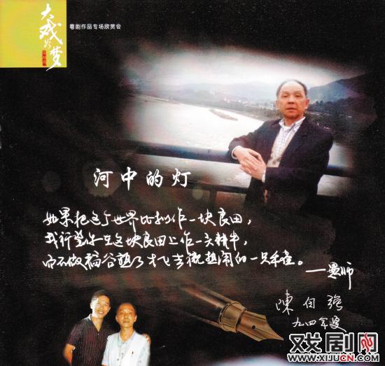 回忆起以“半餐消夜”拜师的陈自强,梁郁南说,老师不光给他写作的指引,还给他很多人生的启迪。在梁郁南粤剧作品专场欣赏会的戏桥首页,就有陈自强的照片和题字。陈自强写道:“如果把这个世界比拟作一块良田,我希望你在这块良田上做一头耕牛,而不做稻谷熟了才飞去凑热闹的一只麻雀。”