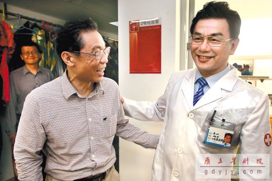 羊城晚报讯记者何裕华报道:“刚看完门诊,就赶过来了。”昨晚7时40分许,中国工程院院士钟南山在广东粤剧艺术中心演艺大楼新剧场后台,握着新编现代粤剧《风云2003》的男主角、广东粤剧院院长丁凡的手,高兴地说。