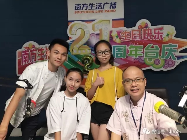 黄文意(左二)和同学周恩(左一)、龚秋嫦(左三)做客我台直播室