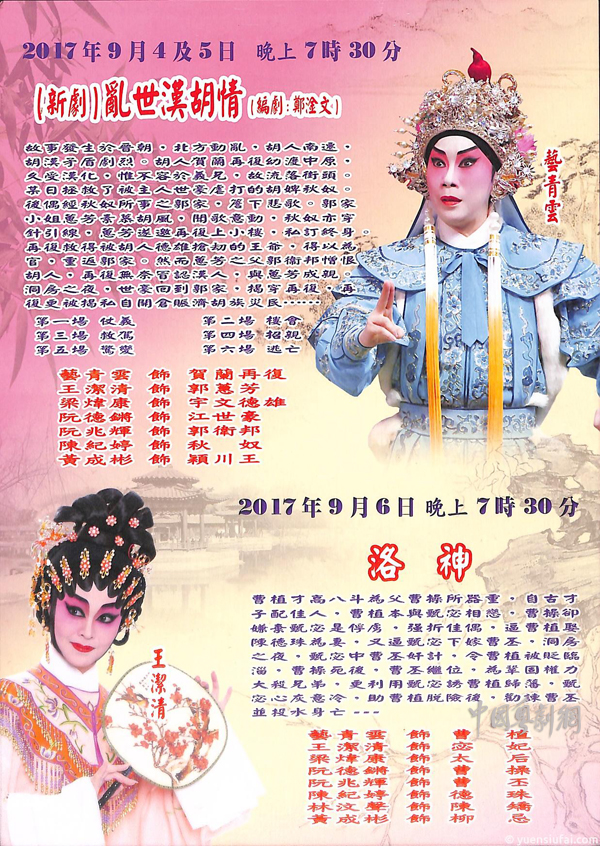 由悦艺剧团主演新编粤剧《乱世胡汉情》与经典粤剧《洛神》将于9月4至6日在香港高山剧场剧院上演,本次有艺青云、王洁清主演,更有阮兆辉、阮德锵等名伶鼎力助演,剧情迂回、精彩,欢迎广大戏迷莅临捧场!
