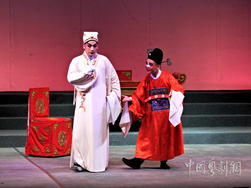 整场舞台,充满大量的舞蹈动作戏份,让我有种看了场“动作戏”的感觉。演员一边唱一边做动作,对他们的基本功考验很大,确实很不容易。它没有那种势必胜败的打斗场面,演员在舞台上的动作却也丰富多彩,具有浓厚的市井气息。如两个衙差吆喝宣布“弃耕捕虫”令的时候,神气活现,不可一世的表情让人预见到成名一家将困难重重。赖地保追打成明、张喜凤,衙差加入,棒打声、吆喝声的交织,让整个舞台顿时充盈丰满了起来。皇帝在御花园嬉戏遇书生和微服至华阴山间找虫的两幕,同样有使舞台丰满的效果。但由于与表现皇家气象和打斗场面相合,没有过多的逼仄之感。成名和张喜凤得知儿子去世后沉痛哀悼的一幕,有别于其他场次,节奏放慢了,动作考究了,音乐哀怨了,我觉得对剧中的节奏也许有一种平衡的功能吧。同时也是剧中主角人物情感在波云诡谲中的沉淀蕴蓄,也就能理解为何成名能够置生死不顾,想出让自己也变成蟋蟀来救子的办法。在与妻子的互相扶持哭诉当中,巨大的悲痛让他无法独自一人苟活,暗无天日吞噬着他的身心,但他仍抱持着一丝微弱的希望,即使居质斧之危、前途漫漫亦在所不惜。