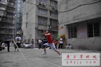 第一场进行的是女单比赛,由祝燕彩(一团)对阵罗绮琪(二团)。罗绮琪在实力上明显占优,前后场的转换十分灵活,大力的扣杀频频得手,毫不逊色于专业运动员。罗绮琪以21:8、21:13两局大比分顺利为二团拿下首捷。