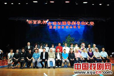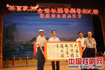 应广东省繁荣粤剧基金会等主办单位邀请,由中央政府驻香港联络办公室宣传文体部及香港丽新集团支持,香港新光粤曲艺术促进会和香港文化艺术基金会联合主办的全港粤剧社团首届“林百欣杯”获奖节目于9月17日到粤剧文化广场演出。全国政协委员、香港丽新集团主席、本次赛事赞助人林建岳先生(林百欣之子),广州市荣誉市民、广州市振兴粤剧基金会创会永远名誉会长林余宝珠女士(林百欣夫人),中央政府驻香港联络办公室宣传文体部处长周佩贞,香港新光粤曲艺术促进会会长张明先生等联合率团前来;广州市老市长黎子流,广东省政协副秘书长邵忠,广东省委宣传部文艺处调研员林原,广东省文化厅文化交流合作处调研员李小辉,广州市振兴粤剧基金会理事长刘长安,广东省繁荣粤剧基金会秘书长何铁赞,广州文化公园主任秦谷良等与香港嘉宾亲切会面。黎子流老市长对林余宝珠女士热爱祖国传统文化艺术、热心社会公益、长期资助广东粤剧界文化事业的善举表示赞赏和感谢;邵忠副秘书长代表省政协办公厅对新光粤曲艺术促进会组织“林百欣杯”获奖节目前来广州作文化交流表示热烈欢迎和感谢,并向客人介绍粤剧文化广场创办近四年以来的工作情况。演出开始前,粤剧文化广场主办单位与演出单位互赠纪念品,省繁荣粤剧基金会、市振兴粤剧基金会同时向林余珠女士赠送著名画家陈永康先生、著名书法家张桂光先生的作品以作留念。随后,黎子流老市长、邵忠副秘书长等领导与中心台场内外800多名观众一起观看了演出。