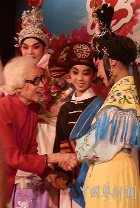 2012年我校粤剧社同学受邀参加粤剧艺术博物馆奠基仪式,仪式上陈建华市长、黎子流老市长与我校粤剧社小红豆合影