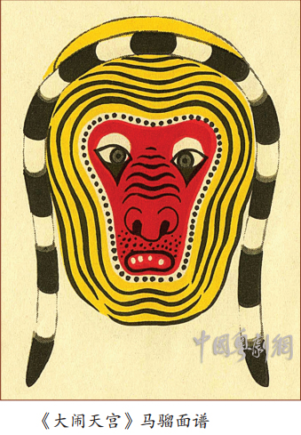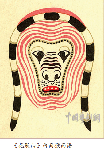 马骝面——面谱。 广州话将猴子俗称为马骝, 在神话小说《西游记》 中的孙悟空本是一只猴子, 所以粤剧戏班将戏中孙悟空的面谱称为“马骝面”。马骝面属于象形面类型; 以自然界的猴子为原形,结合《西游记》对孙悟空的描写, 用红、 黄、 白、 黑四色勾画; 脸部中间一块用红色,四周涂黄色, 以黑色圈脸纹;传统例戏《香花山大贺寿》 的马骝就画此面谱。 后来粤剧向京剧学习猴戏,吸收了京剧猴脸的技法, 再融汇粤剧的特点,改以红色调为主, 画桃形脸, 以白色为衬, 再用黑色勾眉、眼、鼻、 嘴、 脸、,以及嘴旁的云纹,主要是为了突出孙悟空尖嘴缩腮、 火眼金睛的形象特征。 现在粤剧演出孙悟空, 大都按此面谱开面。