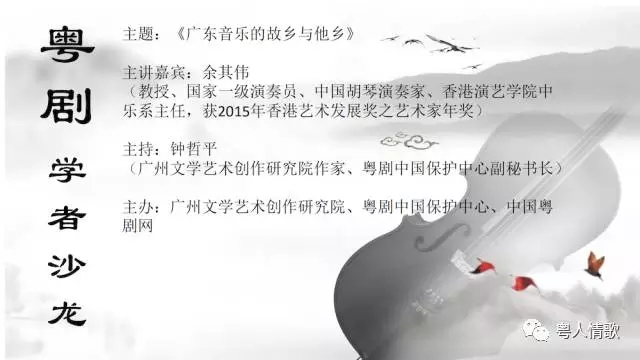 余其伟教授:国家一级演奏员、中国胡琴演奏家、香港演艺学院中乐系主任。2015年,香港艺术发展局为余其伟颁发香港艺术发展奖之艺术家年奖(音乐组别),以表彰余其伟对香港中乐教育及推动大众对广东音乐的认识作出的贡献。 余其伟教授将亲临粤剧学者沙龙,真诚分享广东音乐高山流水中的忧患,繁花满地中的质朴,梦幻空寂中的忘情。机会难得,先来一点点剧透…… 2017年已举办的粤剧学者沙龙 《新旧过渡、雅俗共赏——民国时期的戏曲和文学》,主讲:彭玉平(中山大学教授、博士生导师、长江学者) 《三个双城记:岭南文化视野中的粤剧变迁》,主讲:罗韬(岭南文化学者、广东省政协委员、广东文史委员会委员、羊城晚报编委) 《移动互联网时代的粤剧传播——以中国粤剧网为例》,十位来自不同领域的专家学者共同研究。