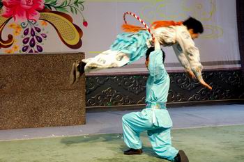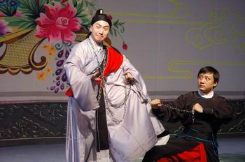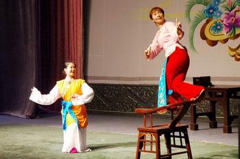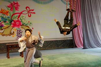 今天上午由二团的八个折子戏参赛。泼辣的七姑奶一开场就 将全场气氛带动了起来。紧接着梁晓莹在《盗草》中表演了身手不凡的白蛇;张三郎、梅英、杜丽娘、刘秀、哪吒、时迁 ……演员们将一个个的人物惟妙惟肖的展现了出来。陈小刀在《盗甲》中的技巧进行了改动,以前是爬上桌子后盗到盒子, 然后翻下来,这次他运用了一根绳子,在上面上下自如将“鼓上蚤”形象生动的表现了出来,给在场的评委留下了深刻印象。