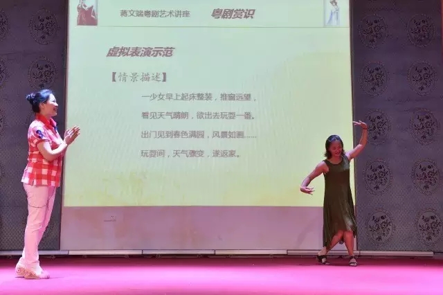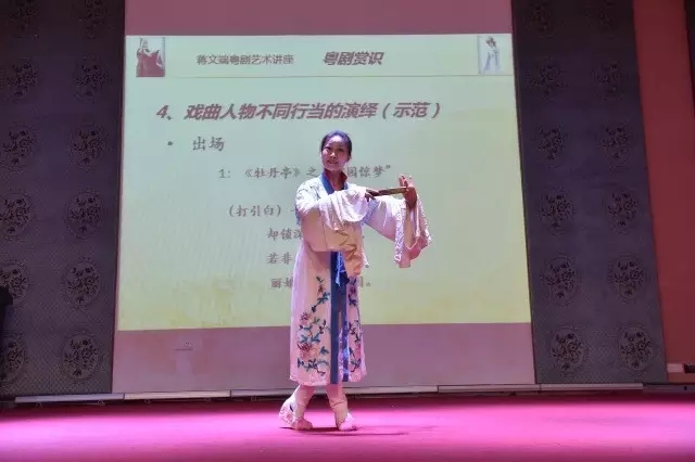 2016年8月23日下午,我院国家一级演员、中国戏剧梅花奖得主蒋文端受邀参加由顺德区文化艺术发展中心、龙江镇宣传文体办公室主办、龙江镇文学协会协办、蔡伯励书院承办的2016顺德区“百场文化公益培训进基层”--龙江大讲堂系列活动,作了题为《粤剧赏析》的主题讲座,讲座吸引了众多粤剧发烧友和戏迷慕名而来一睹名家风采。 讲座上,蒋文端分享了自己从艺30多年来的演艺成长经历和表演心得。讲述了粤剧与中国戏曲的关系,分析中国戏曲的共性和粤剧的独特魅力。通过PPT展示,介绍了粤剧与其他剧种化妆、服饰的异同;特别强调了戏曲虚拟表演的特点,并亲身示范,展示各种不同性格人物的表演程式。 讲座现场