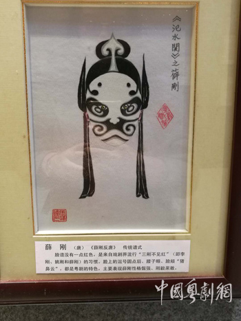 展厅内多数手绘脸谱附有说明,不但对具体人物脸谱的特点、绘图元素加以解释,也呈现出粤剧脸谱许多基本准则和习惯。比如《薛刚反唐》一剧中薛刚的传统谱式,脸谱为纯黑白,“来自戏剧界流行‘三刚不见红’(即李刚、姚刚和薛刚)的习惯”。又如脸上画蝴蝶形表达人物好色,鸟形眼所表达的人物是会飞的神仙或寿命不长,这些特点,从用色、图案纹理,都具有鲜明的地方戏剧特色以及传统精神文化的深厚底蕴。