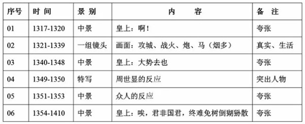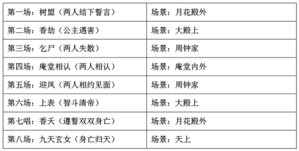 《帝女花》由四个小时的舞台剧拍成一个半小时的电影,在故事情节上进行了重新安排,叙事的节奏也进行了调整,基本遵照舞台叙事模式的空间讲述故事。从表一中能看出,电影中的场景空间设置十分清晰,故事情节与场景变换相呼应。