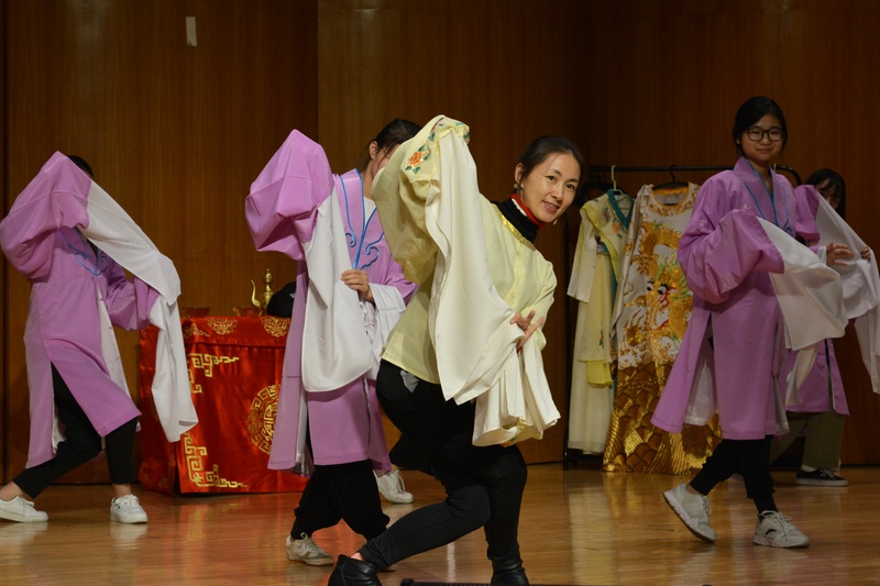在讲解戏曲表演的另一特点——程式性时,邱小娜分别用“花旦”、“小旦”、“青衣”、“老旦”等行当的表演特色,向同学们示范了不同行当的“观鱼”、“赏花”、“看鸟”等动作。