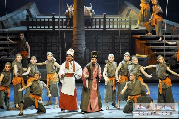 在表演和唱腔方面,创作人员在原来的基础上增加“梆簧”唱段,使角色的行当感觉和粤剧传统的表演程式更加鲜明,成功塑造了由丁凡扮演的主人公“六哥”敢为天下先的岭南人形象。“升级版”的《南》剧最大的改动是人物性格,重新梳理了主要角色之间的关系,特别是三位主角,不再是剪不断、理还乱的三角暧昧关系。扮演“林花”一角的蒋文端表示,修改后的人物个性更加突出。与旧版相比,在饰演“林花”时更为得心应手,她对“六哥”的牺牲在观众面前更具说服力。剧中波斯风情的曲调与传统板式的结合是粤剧界中大胆探索之举。由梁淑卿扮演的波斯富商之女古丽,更是形神兼备,十足“生鬼”,每次出场,都十分吸引观众。尤其是当她用西洋人的发音喊“六哥”,跟懵懂的六哥说“月光好浪漫”,比着手势说“OK”的时候,台下都会发出阵阵会心的笑声。在舞美上,利用巨型投影营造大海的磅礴气势仍是此剧的亮点之一,除保留原有的经典部分外,舞美创作组在细节上动了若干小“手术”——如设计了“桅杆船帆断裂”等桥段,使舞台视觉效果更为震撼人心,李六哥与林花旷世千古,情动海天的婚礼更为顺理成章。