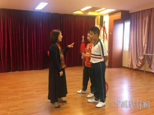 倪惠英老师在对林家熙、胡铭恩两位同学进行细心的唱功指导