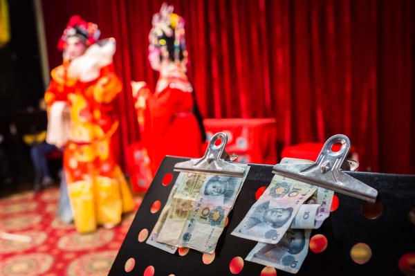 记者现场观察发现,观众的打赏丰俭由人,有的相当慷慨。一曲《窦娥冤》的粤曲悠悠传来,这位演员先后获得了五位观众的打赏,价格分别是10元、20元、30元、50元、50元。短短的五分钟时间内,获得了160元的收入。