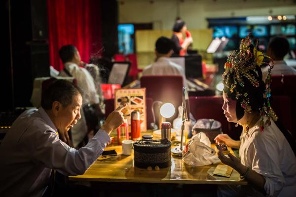 云峰粤剧团的演员在“后台”。