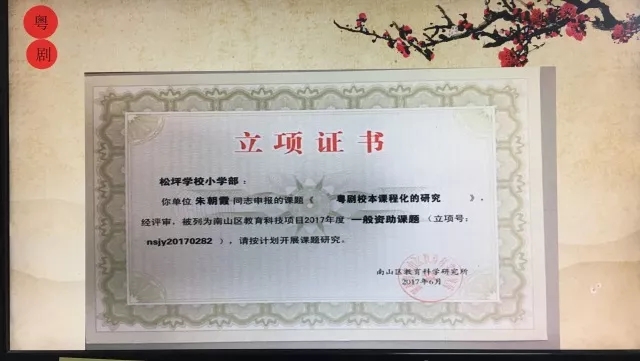 传承瑰宝 松坪小红豆 松坪学校粤剧社团简称“松坪小红豆”,成立于2016年10月。秉着“以弘扬本土优秀传统文化,推动粤剧的传承和发展”的宗旨。一年来在南山区文体局,深圳市南山粤剧团以及松坪学校领导的鼎力支持下,粤剧得以顺利进入松坪学校的校园,孩子们跟粤剧有了零距离的接触,对广东戏曲有了初步的认识,通过演绎,孩子们对粤剧的了解也越来越深。 粤剧折子戏《穆桂英》 粉墨登场舞枪弄棍 戎装上台演起传神 粤剧片段《五彩莲台》 高唱低吟演传奇 唱念做打舞春秋 插科打诨逗乐事 啼笑喜怒成隽永 孩子们台上的表现举手投足是那么的传神,演得活灵活现、微妙维俏、有板有眼、有声有色。旦、丑、净、末个个了得;唱、打、念、做有模有样。 现代粤剧小唱《红豆相思曲》 现代粤曲小唱是普及粤剧最好的途径。 小演员风采 武旦 强大的师资队伍 许兰卿老师 有了一群为传承传统文化不断努力的人,加上学校领导的鼎力支持和社会力量的帮助,“松坪小红豆”定会茁壮成长的!