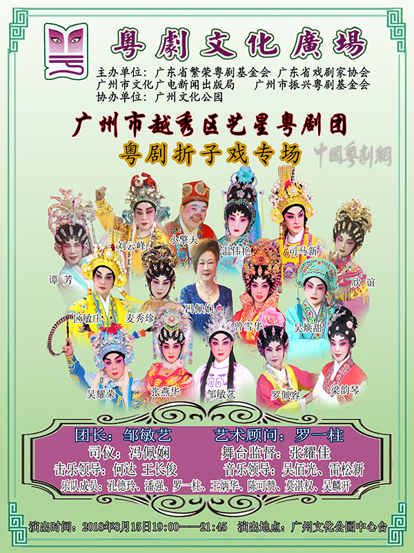 近期,越秀区艺星粤剧团排演了“粤剧行当展演”,作为庆祝团队成立15周年的献礼。节目以“生、旦、净、末、丑”各行当小戏串烧的形式,展现粤剧人物角色的表演特色,也充分展现了团队的实力。同时,参加“走进新时代 唱响主旋律——2018年广州市老年人文艺展演越秀区专场”的展演,并获优秀奖。