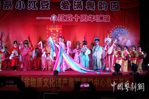 小红豆艺术团成立于2005年,创办人姚冠冰女士今年82岁高龄,是街口街道办事处退休干部,也是一位粤剧发烧友。小红豆艺术团成立以后,在党和政府有关部门及热心人士的大力支持下,先后无偿培训学员438人,向广东省粤剧学校输送了13名学生。十年来,小红豆艺术团在从化演出了30多次专场,参加其他公益演出数百次,并先后在从化街口街中心小学、江捕街联星小学等学校举办粤曲曲艺第二课堂。小红豆艺术团注重对学员的品德教育,在学粤曲的同时,组织学员学习弟子规等优秀传统文化,还组织学员参与扶困助学,关爱弱势群体等社会公益活动。