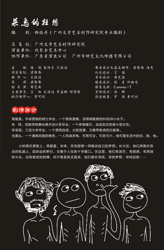 前言:广州市戏剧创作孵化计划五部新剧展演,是观众对新人新作的一次检阅,欢迎走进剧场,提出宝贵意见,共同扶助新人成长。