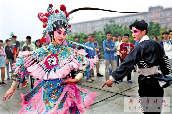 昨天,广东粤剧院的演员在广州美术学院进行“快闪”活动,“武松”、“扈三娘”等与学生近距离交流。5月至6月,广东粤剧院将联同广州市10所大学主办“粤剧进校园系列活动之‘粤剧与咏春’专题讲座”,国家一级演员、广州咏春传人、广东粤剧青年团副团长彭庆华主讲。讲座以“粤剧”与“咏春”这两个同属于广东传统文化的鲜明符号作为话题,兼具专业性、趣味性和互动性。昨天的“快闪”是为5月13日在广州美术学院进行的第一站活动“预热”。