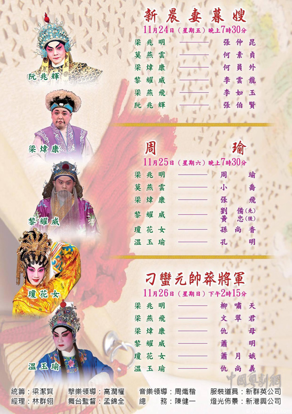 由粤剧名伶梁兆明、莫燕云、梁燕飞合力主演的《新晨妻暮嫂》、《周瑜》和《刁蛮元帅莽将军》将于11月24-26日,一连三日在香港高山剧场剧院公演,本次演出还邀来阮兆辉、梁炜康、黎耀威、琼花女、温玉瑜等粤剧红伶搭配实力阵容,剧情精彩,睇头十足,广大戏迷万勿错过!