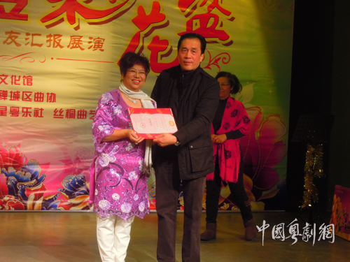 非遗粤曲项目市级保护单位佛山市文化馆馆长袁新荣(右)向沈小梨9左)颁发非遗市级代表性传承人证书。