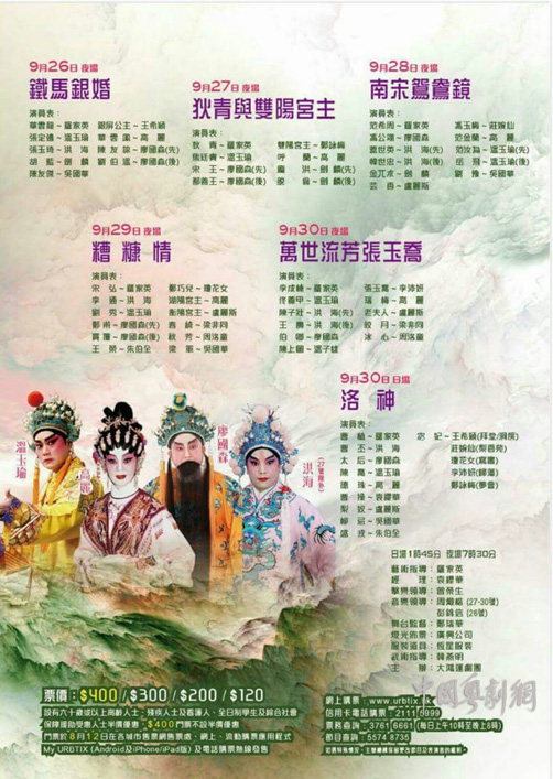 由“大鸿运剧团”主办,罗家英携五位花旦王希颖﹑郑咏梅﹑庄婉仙﹑琼花女及李沛妍,在香港高山剧场新翼演艺厅,演出“一生五旦展英姿”五天六套名剧,剧目包括:9月26日之《铁马银婚》(罗家英、王希颖)、9月27日之《狄青与双阳宫主》(罗家英郑咏梅)、9月28日之《南宋鸳鸯镜》(罗家英、庄婉仙)、9月29日之《糟糠情》(罗家英、琼花女)、9月30日(日场)《洛神》罗家英联同五旦演出及9月30日(夜场)《万世流芳张玉乔》(罗家英),名剧大集合,粤剧迷们不要错过啦!