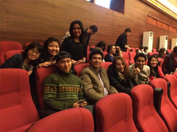 汉语系的老师和留学生们入场前在剧院精心布置的海报前留影