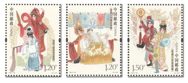 该套邮票由中国邮政于2017年10月15日发行,一套3枚,图案内容分别为颇具岭南特色的《香花山大贺寿》、《六国大封相》、《玉皇登殿》这三出粤剧中的传统例戏,邮票大版过桥则表现了经典曲目《天姬送子》。