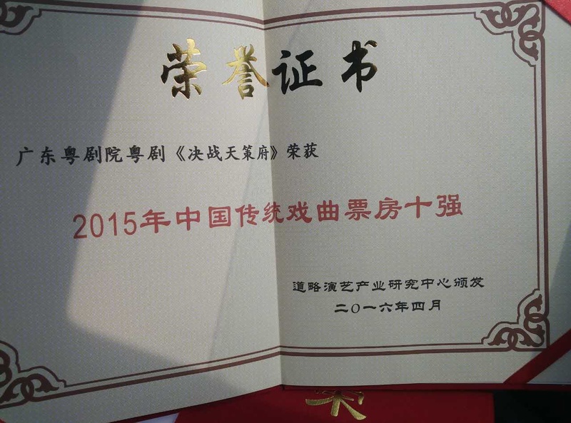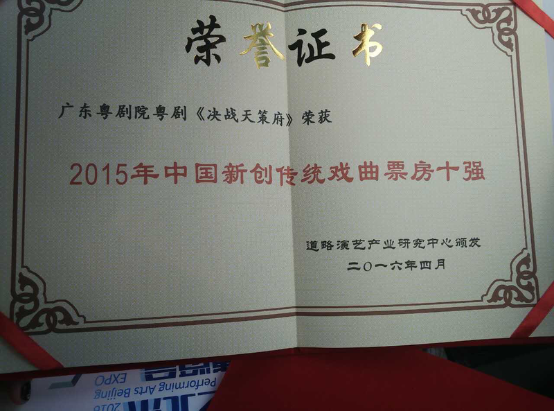 4月12日下午,在北京中华世纪坛举办的2016 “演艺北京“博览会上,粤剧《决战天策府》被正式宣布获得“2015年中国传统戏曲票房十强”、“2015年中国新创传统戏曲票房十强”双项第一。
