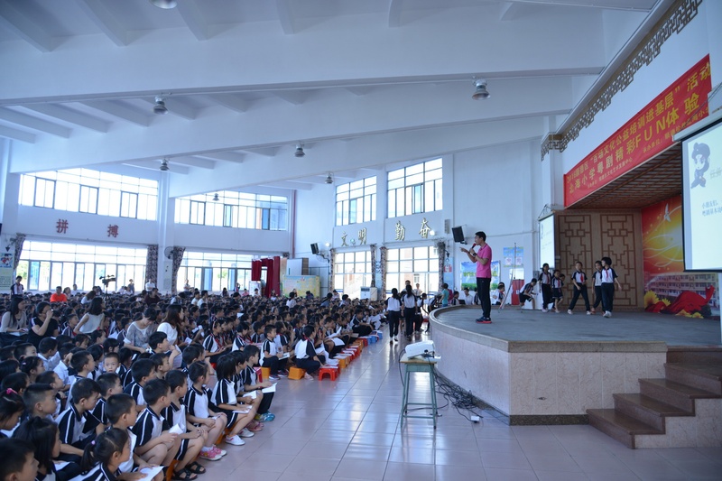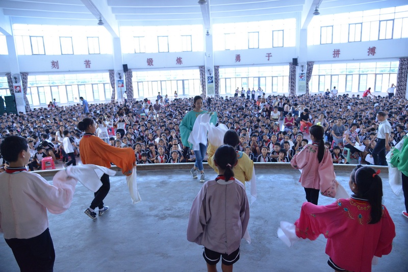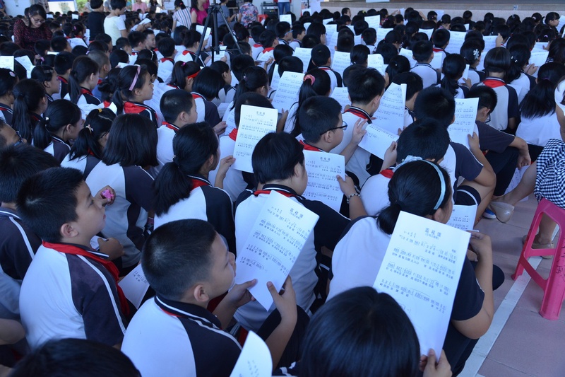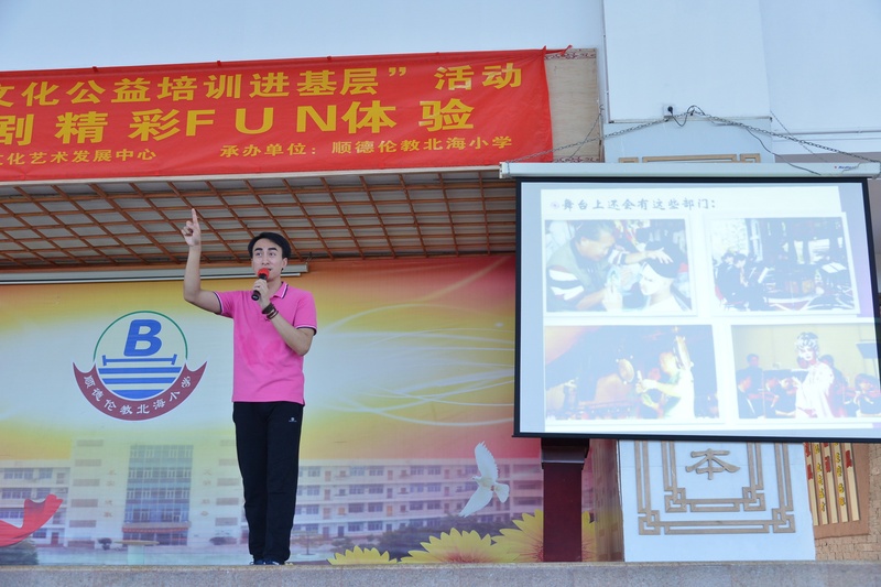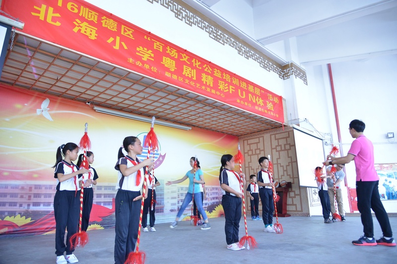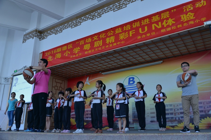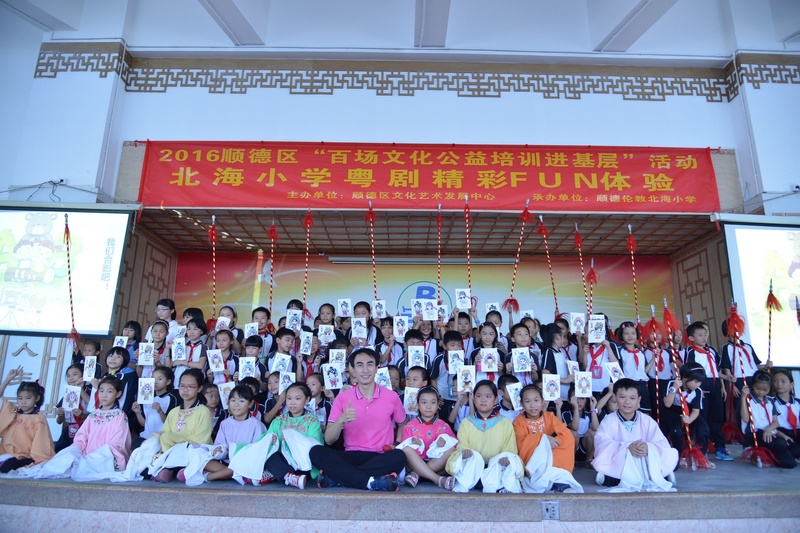 “卖荔枝,身外是张花红被……”顺德伦教北海小学响起了阵阵歌声。原来是我院国家一级演员文汝清来到顺德伦教北海小学为全校1800多位学生上粤剧课。10月27日下午,该小学的学生下了第一节课后,非常有秩序地排队进入学校的运动馆上粤剧课。顺德是粤剧之乡,很多学生从小就有接触粤剧,看过棚戏,该校也从今年开始设立了曲艺班。得知学校举办粤剧大课堂,文汝清要来授课,学生们兴奋不已。