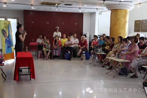 讲座现场一,琼霞老师绘声绘色地讲授着关于粤剧唱腔中吐字、发音、用气方面的技巧。