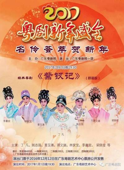 2017年1月1日晚上演的是经典粤剧《紫钗记》(群星版),由国家一级演员、梅花奖获得者丁凡、姚志强、麦玉清、蒋文端,国家一级演员林家宝以及青年演员李嘉宜、梁晓莹等轮番搭档登场,在元旦夜为观众献上粤剧大餐。三位“李益”四位“霍小玉”如何搭档?暂时保密,演出现场自见分晓。