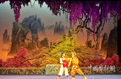 随后狐仙九妹胡秀英爱上樵夫刘海,在山上学他砍柴并表明心意,与他结为夫妻,并用自己的宝珠医治了失明的刘母,一家人过上男樵女织的幸福生活。金蟾精在中秋变作一失明老翁,骗走九妹的宝珠,意欲升仙。九妹失去宝珠怕露出狐狸原型,只好忍痛回山。刘海闻讯赶来,得到蛇神帮助,与狐仙姐妹同斗金蟾精,为九妹抢回护身宝珠。刘海从一个只会砍柴的樵夫,摇身一变拥有与金蟾精相抗衡的本领,南派武功又在其中。在他与金蟾精的多次交手中,笔者看到了桥手、马步等元素,让原本在喜剧中所占比例不大的武打场面精彩起来。