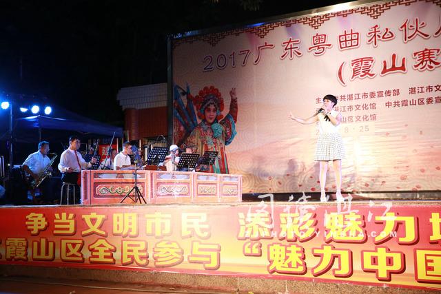 8月25日晚上,摄影师看到,由中共湛江市委宣传部、湛江市文化广电新闻出版局主办,湛江市文化馆、中共霞山区委宣传部等单位联办的2017广东粤曲私伙局大赛(霞山赛区)选拔赛在该区步行街开心广场举行。《重上媚香楼》、《夜战马超》、《梦会太湖》、《碧海狂僧》、《再进沈园》、《媚香楼》等6个比赛曲目进行了现场表演,现场打分评比。最后,湛江市粤海风华曲艺团表演的《碧海狂僧》以97.06分获得第一名,其与银声曲艺团表演的《重上媚香楼》和粤凯曲艺团的《媚香楼》拟推荐进入湛江市决赛。