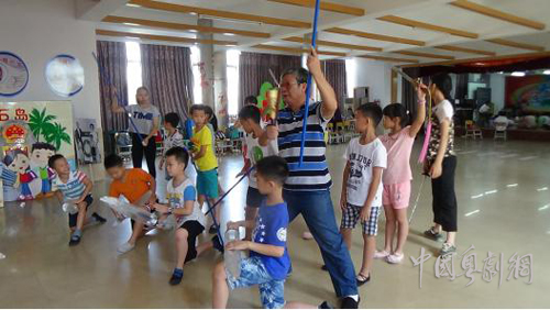 在训练当中,两位老师配合十分默契,徐老师负责教唱曲,何老师负责教动作,小朋友们也努力地吸收老师们传授的知识。何老师教小红豆们学习刀剑棍表演套路,每排练完一段动作之后,何老师即席进行点评,还手把手演示动作要领,舞台身段动作一招一式,刚阳健美,孩子们练习兴致勃勃。徐旭棋老师一把高胡、一叠曲谱,教授孩子们练唱曲目,还在黑板上写上要领,他的高胡演奏音准、力度、节奏、音色俱佳,孩子们练唱收获良多。