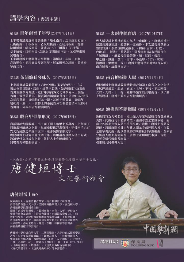 继7月1日的第一讲《百年南音千年情》和8月5日的第二讲《茶韵悠长琴味苦》讲座结束后,受到广大南音、古琴迷的追捧,唐健垣博士将于9月2日至12月2日在香港跑马地,陆续开展中华千年文化主题讲座,其中第五讲的《南音檀扳断人肠》同样值得琴曲爱好者的关注,欢迎广大爱好者前来领略中华千年文化的朴与美!