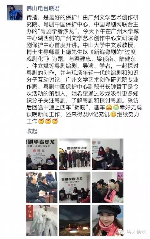 佛山电台主播晓君发朋友圈说:“学者、编剧互动讨论,沙龙吸引了更多知识分子关注粤剧、了解粤剧和探讨粤剧。”