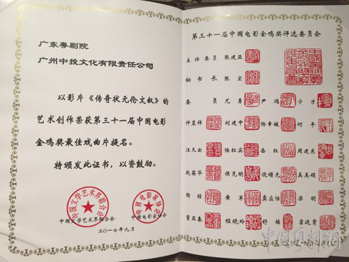 9月16日晚,第31届中国电影金鸡奖颁奖典礼在内蒙古少数民族体育运动中心举行,由广东粤剧院与广州中投文化有限责任公司合作出品的粤剧电影《传奇状元伦文叙》荣获“最佳戏曲片提名奖”。粤剧电影《传奇状元伦文叙》的主演丁凡、蒋文端,广州中投文化有限责任公司董事总经理岑力辉、副总经理张海洋等应邀出席了颁奖典礼。