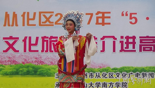 从化区2017年5·19“中国旅游日”暨从化文化旅游推介进高校系列活动启动仪式,于5月19日上午在中山大学南方学院隆重举行。从化东风小学武术队的麒麟舞、从化街口街小红豆艺术团的粤剧折子戏《香夭》,精彩表演引发全场嘉宾热烈掌声。
